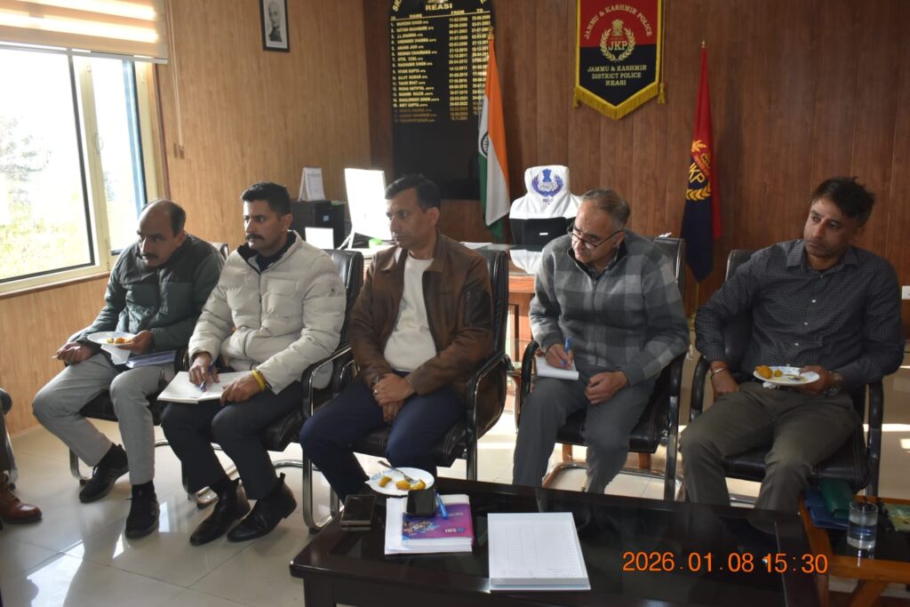 रियासी, 08 जनवरी 2026: जिले में मौजूदा सुरक्षा परिदृश्य की समीक्षा तथा आपसी तालमेल और खुफिया सूचनाओं के आदान-प्रदान को मजबूत करने के उद्देश्य से आज जिला पुलिस कार्यालय रियासी में सब्सिडियरी मल्टी-एजेंसी सेंटर (SMAC) की महत्वपूर्ण बैठक आयोजित की गई। बैठक की अध्यक्षता श्री विपन चंद्रन, अतिरिक्त पुलिस अधीक्षक कटरा ने की।