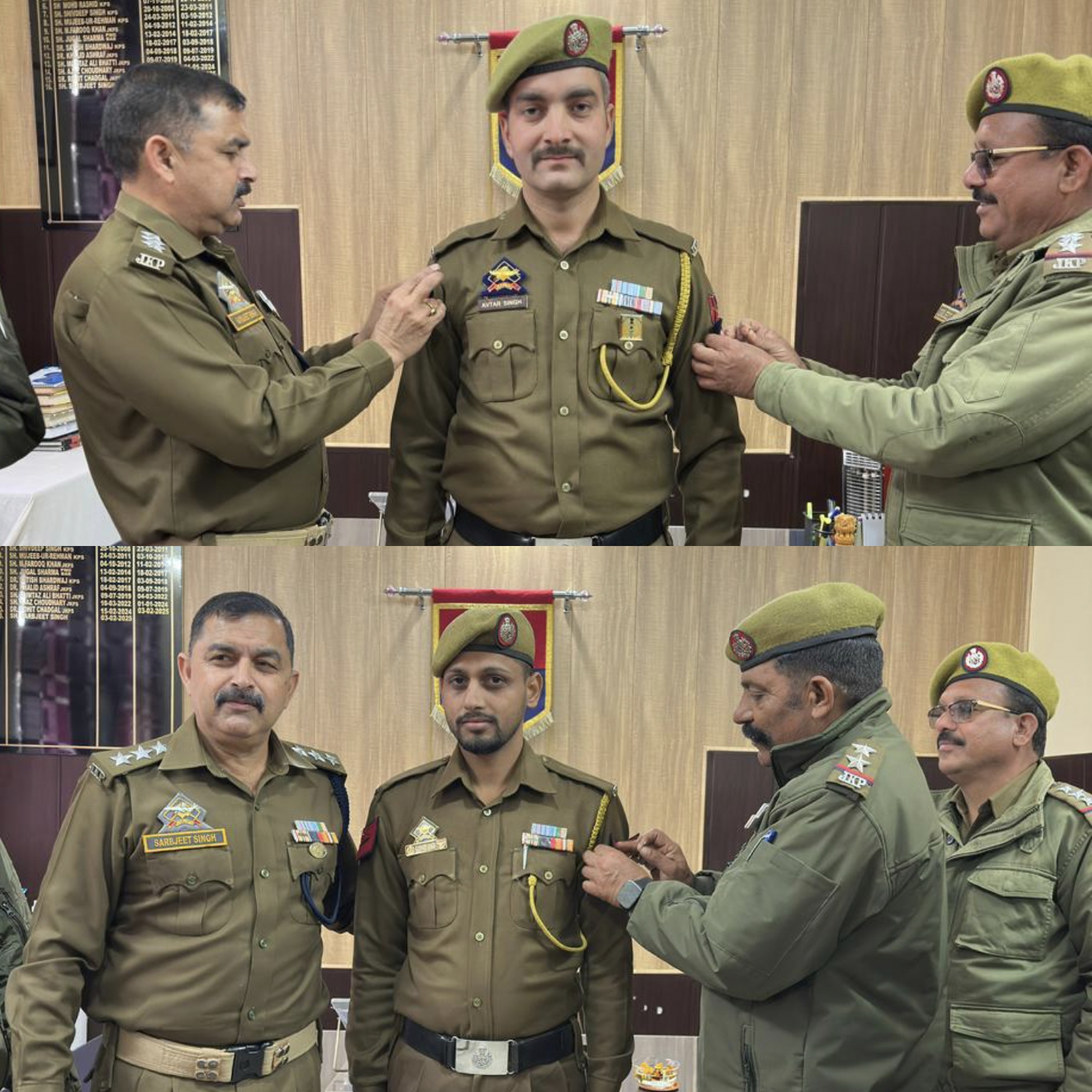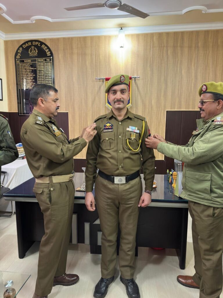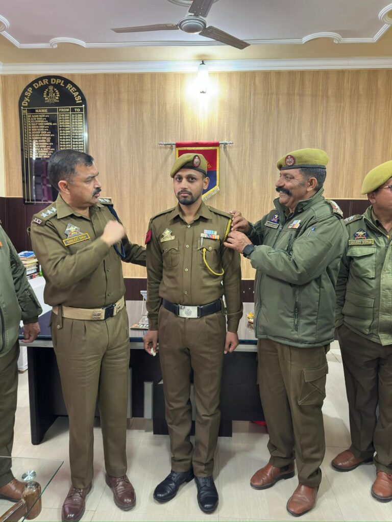इस गौरवपूर्ण क्षण में कांस्टेबल अवतार सिंह, कांस्टेबल कश्मीर सिंह, कांस्टेबल मोहद सलीम और कांस्टेबल कमल राज को औपचारिक रूप से सिलेक्शन ग्रेड कांस्टेबल के पद पर पदोन्नत किया गया। कार्यक्रम के दौरान डीवाईएसपी (DAR) डीपीएल रियासी श्री सरबजीत सिंह ने नवपदोन्नत कर्मियों को उनके नए रैंक के बैज लगाकर सम्मानित किया। इस अवसर पर आरआई डीपीएल रियासी इंस्पेक्टर सुखबीर सिंह, आई/सी पीसीआर रियासी इंस्पेक्टर सुरजीत कुमार, एलओ डीपीएल रियासी एसआई राजिंदर सिंह सहित अन्य अधिकारी व पुलिस कर्मी उपस्थित रहे।