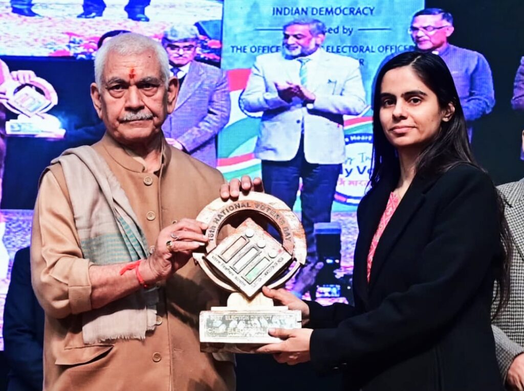 यह पुरस्कार जिला रियासी में चुनाव प्रक्रिया के सफल, पारदर्शी और कुशल संचालन, सूक्ष्म योजना, मतदाता हितैषी पहलों तथा उत्कृष्ट चुनाव प्रबंधन के लिए प्रदान किया गया। उनके नेतृत्व में जिले में मतदाता सहभागिता बढ़ाने और लोकतांत्रिक प्रक्रिया की पवित्रता बनाए रखने के लिए प्रभावी कदम उठाए गए।